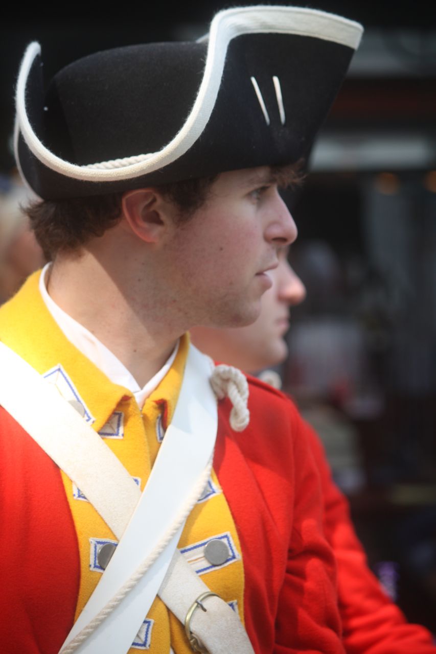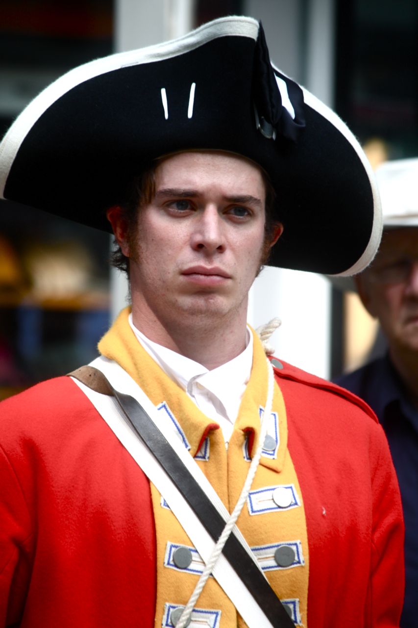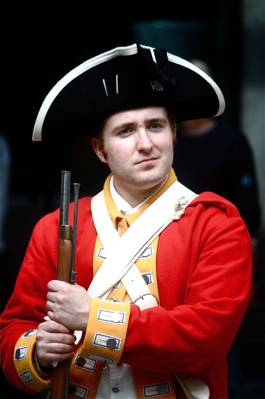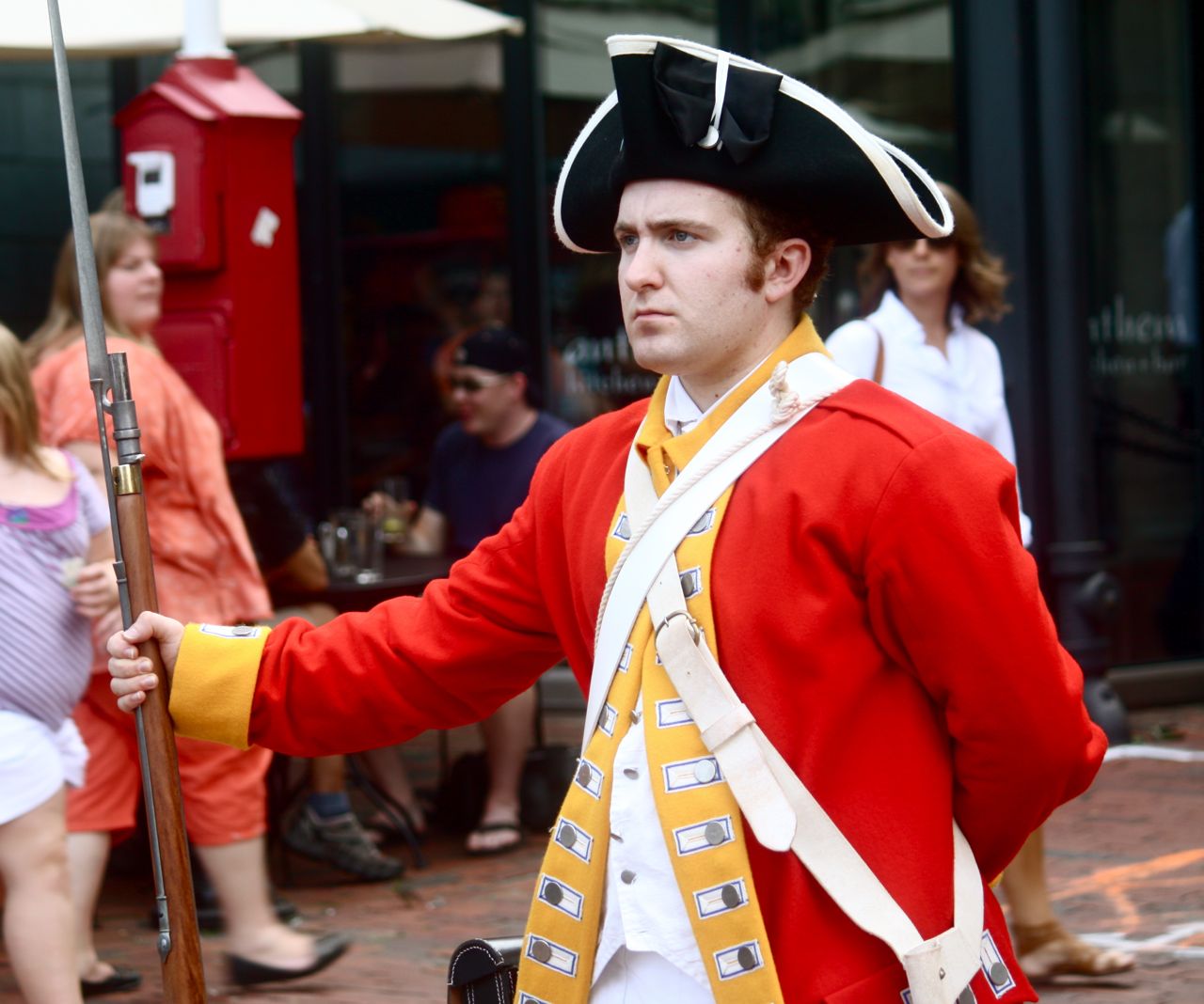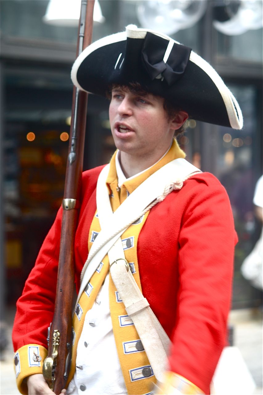 With musket and bayonet, ready to take over the food court. Talley ho dear sir, I hear they make a mighty fine lobster sandwich at ye old New England seafood stand. Actually, the guy, speaking in a British accent, announced him and his buddies were over to do a little changing of the guard. Then he said to get out of the way, lest you be gored by his bayonet.