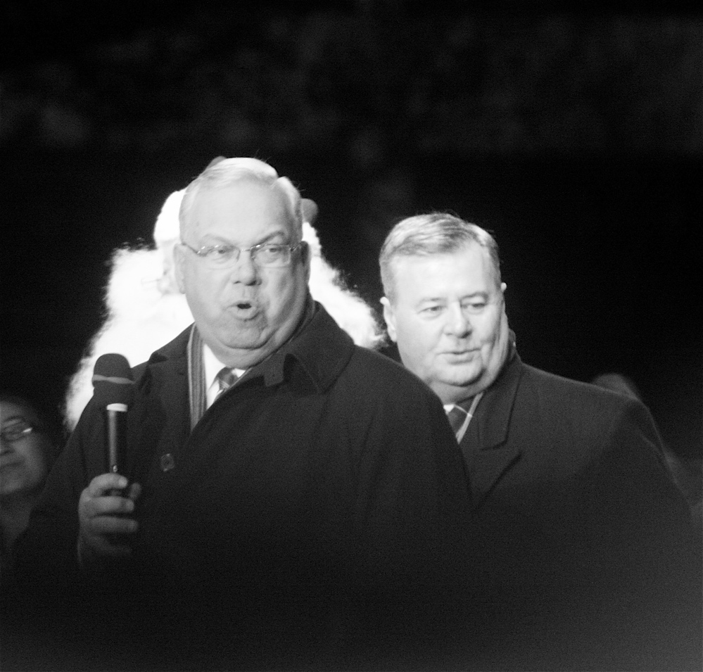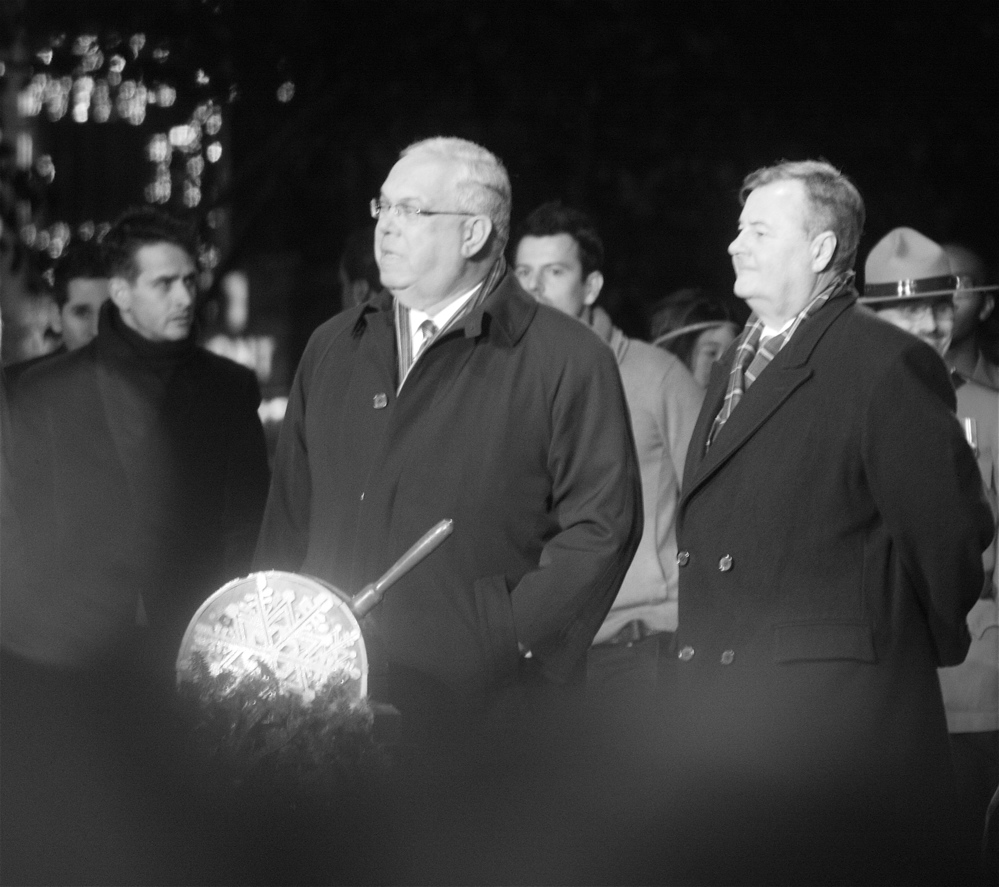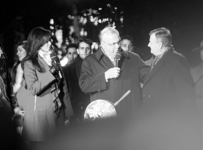 And finally for the main event.  Boston Mayor Tom Menino, came to light up the Christmas tree.  He uh, well, he isn’t as prepossessing as the other attendees.  But I got him, somehow, photography smoke and mirrors, he made the blog.  Tom Menino, if you read this blog, you, along with Rufus the Colored Bull Terrier, Victoria Beckham and the Green Line are featured on a blog.  Try to get on with life.  Photos: