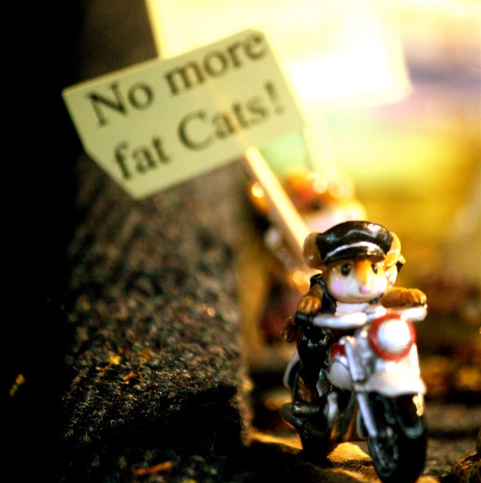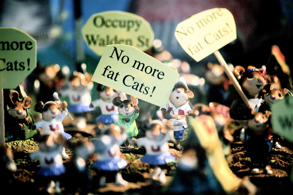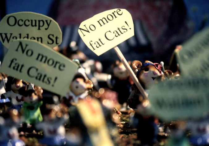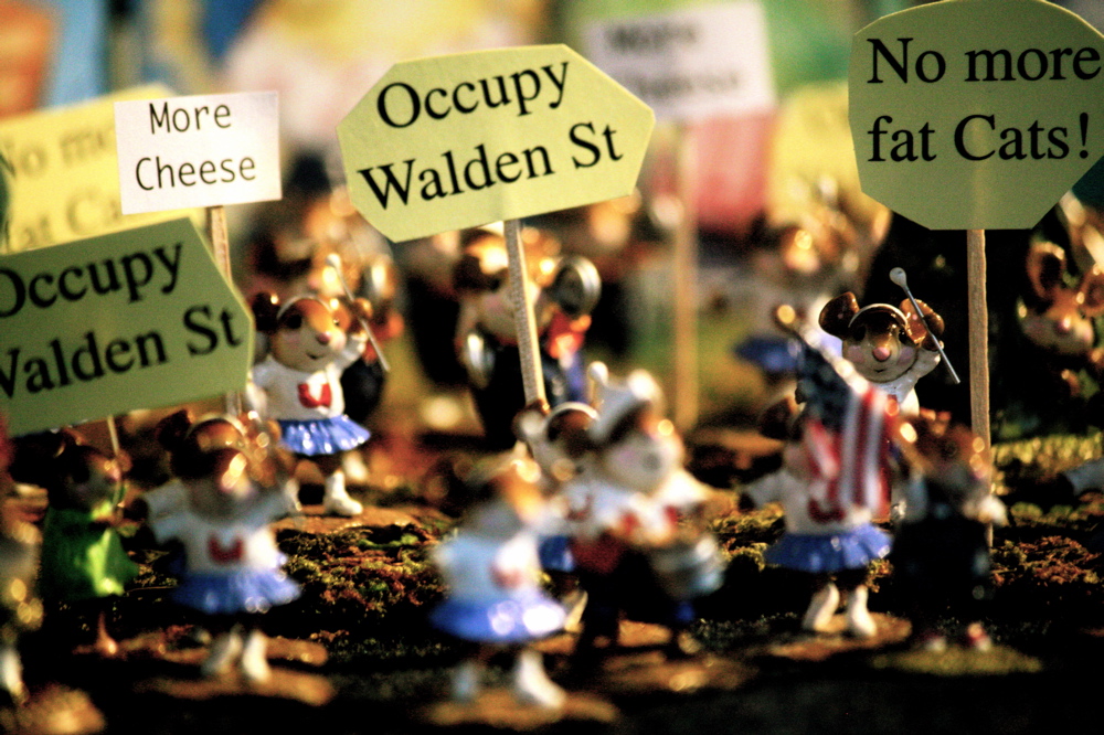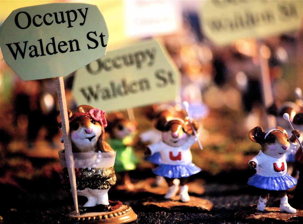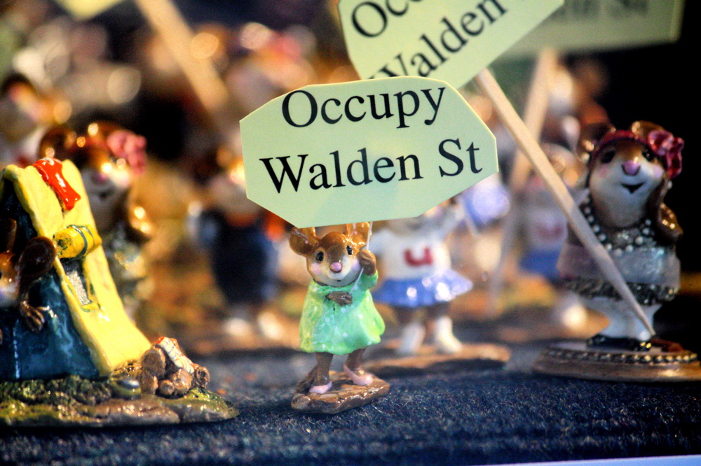 On that note, let’s look at some photos of figurines of mice holding up “Occupy Walden Street” in Concord.