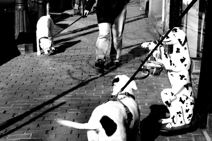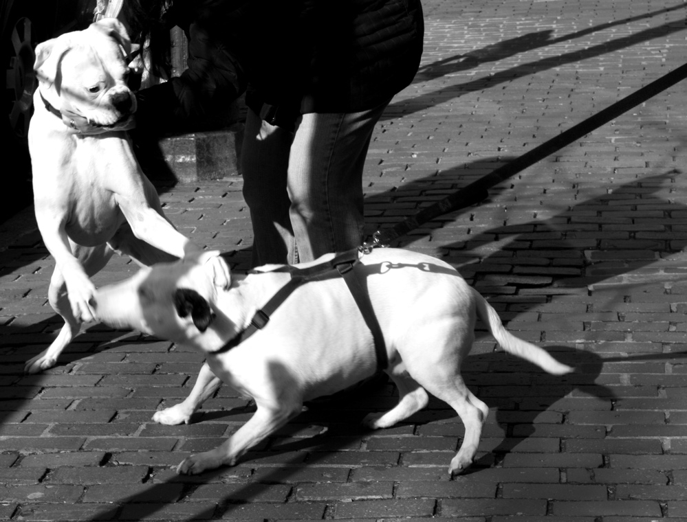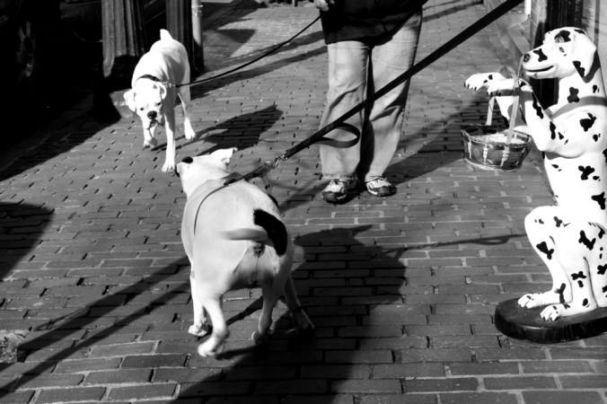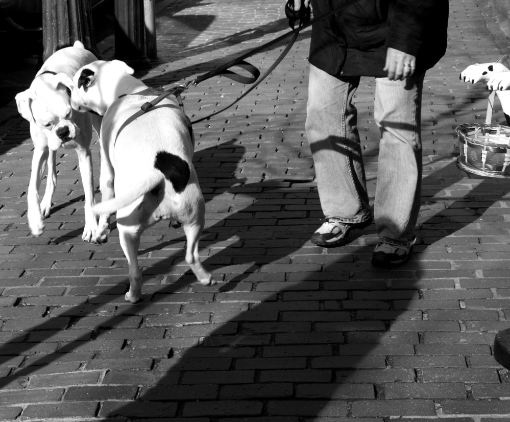 This bull terrier was called Gun, short for Gunnery Sergeant, the owner willingly related to me. The bull terrier was doing what a bull terrier does. She wanted to go into a pet store there on Beacon Hill, where there were plenty of things to knock down and animals to scare. She couldn’t likely because of her behavior previously, so she was stubbornly waiting there. As bull terriers do. Then I tried to take her photo and her owner threw a dog biscuit down on the ground for her to get her attention. Nothing. Again, typical bull terrier.