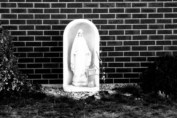Here’s a Virgin Mary in a Virgin Mary vestibule done up Walker Evans/American Gothic style to note the memory with: