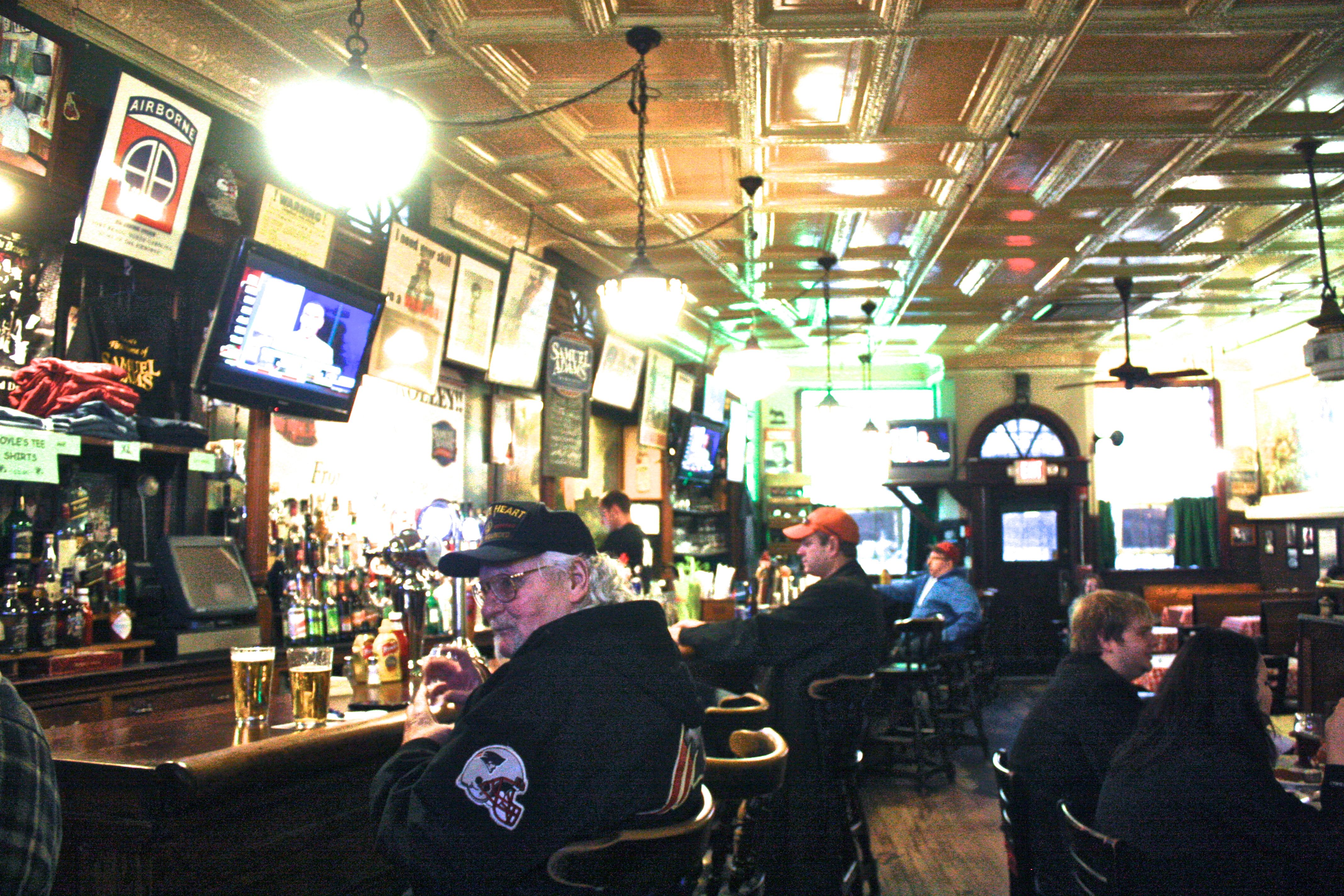 Yesterday I almost literally stumbled upon such a place.  A work duty took me to the Sam Adam’s brewery, with its kegs and its large metal containers that look like aliens.  And the free beer drinking hour, all observed enthusiastically.  Then, suddenly a suggestion comes.  Let’s visit Doyle’s Cafe or just Doyle’s Bar (or Baaaah as the locals would say).  This place had been featured in movies like Mystic River, so it had to be worth a visit.  At least to soak up some local color.