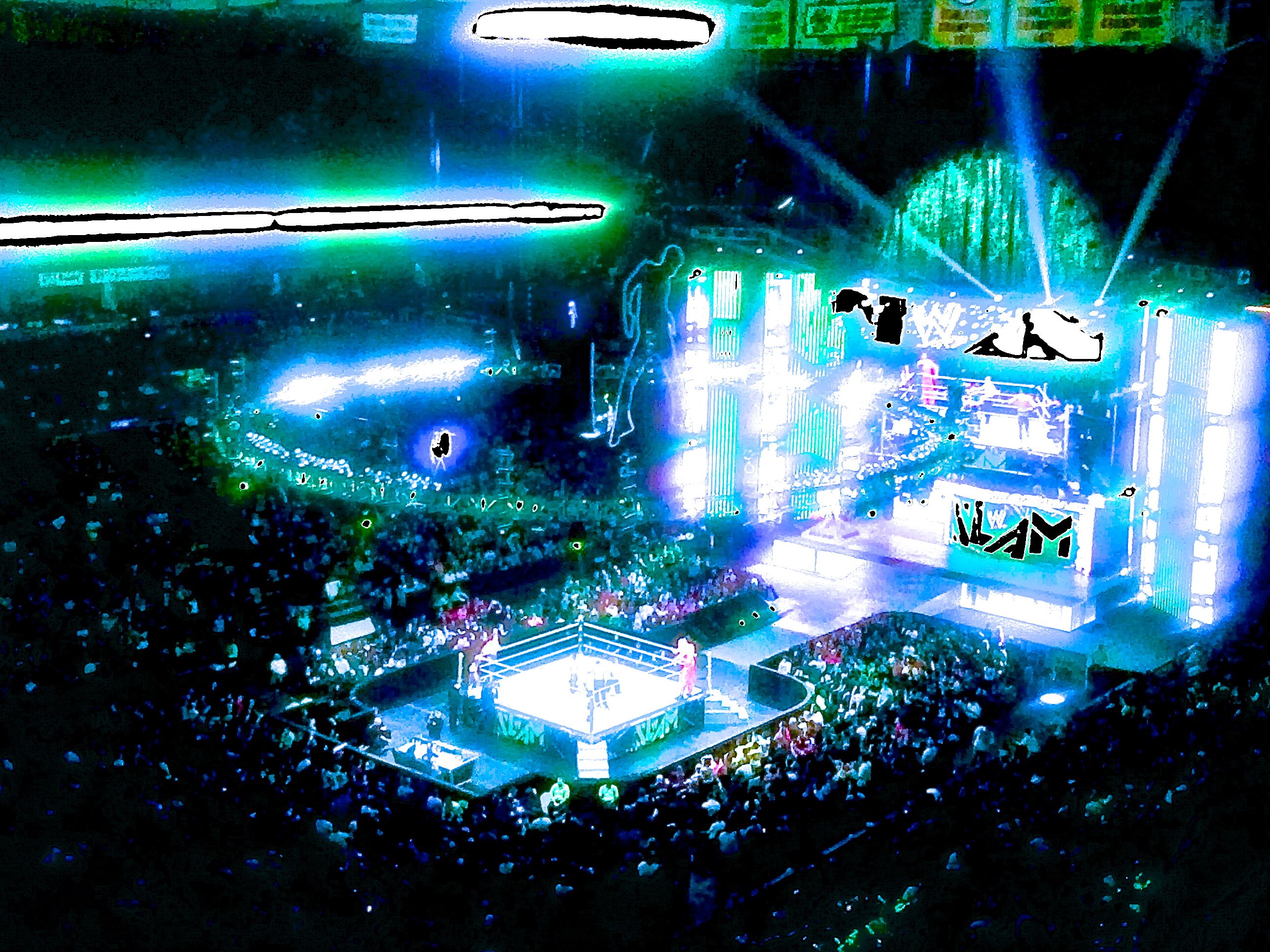 Yeah, I know, it kind of looks like a model of wrestling, but no, it is an actual WWE event. My camera resources were limited. The ticket stub made it rather clear that my giant camera would be unwelcome and my smaller camera is a bit out of commission after ski season, so all I had was my phone. I sharpened, I improved the photos on my computer.