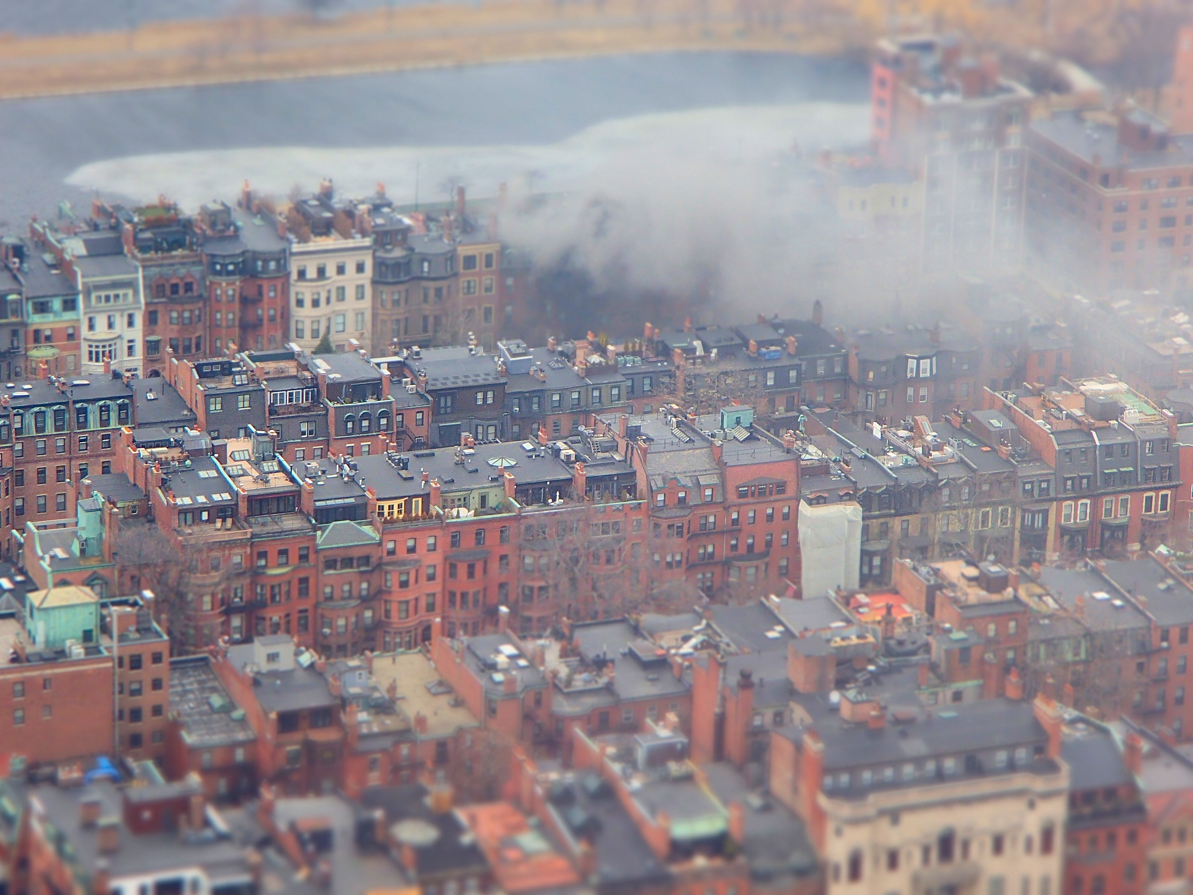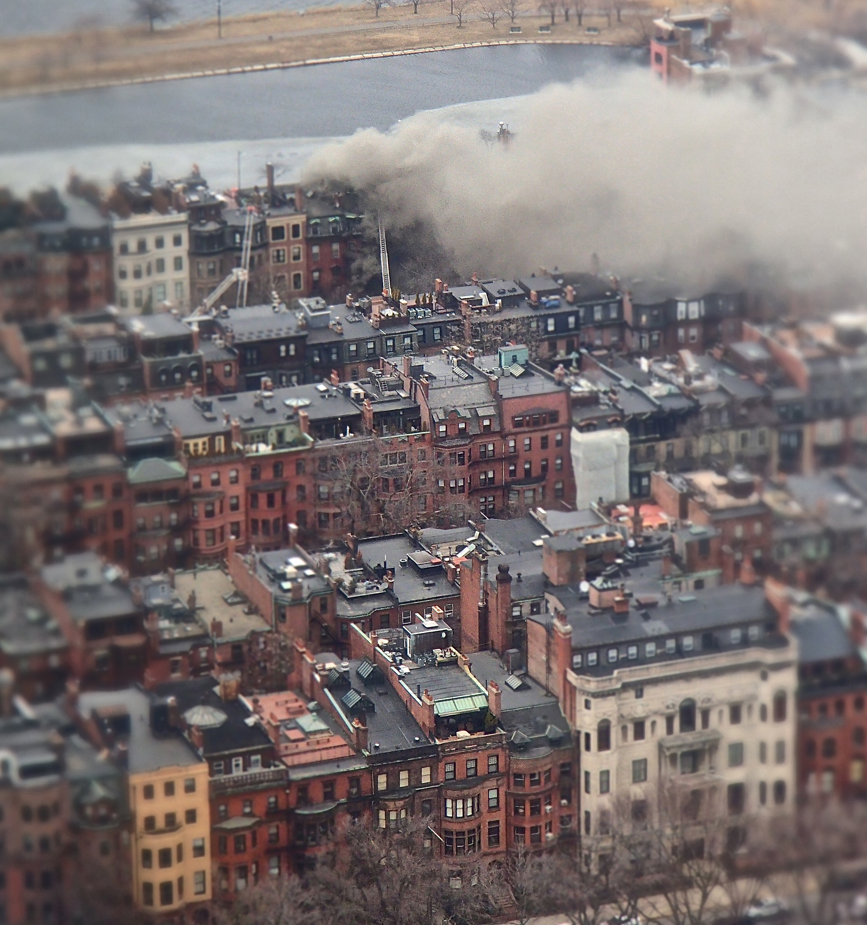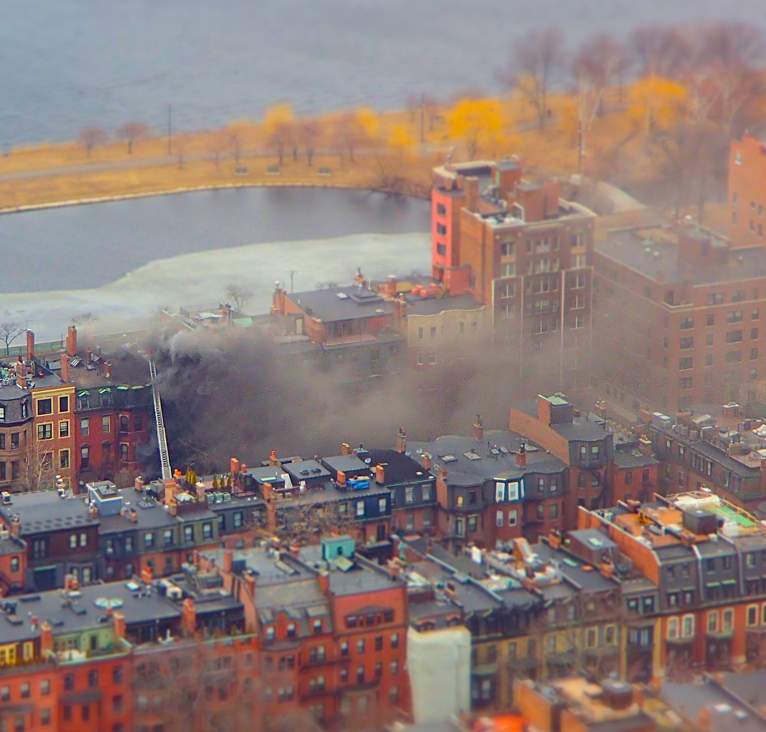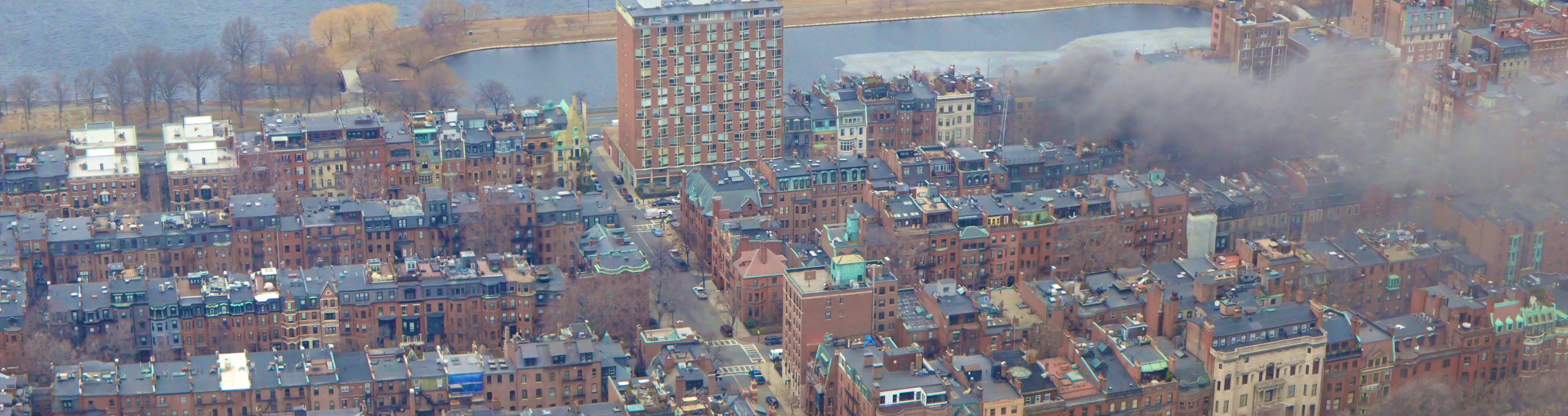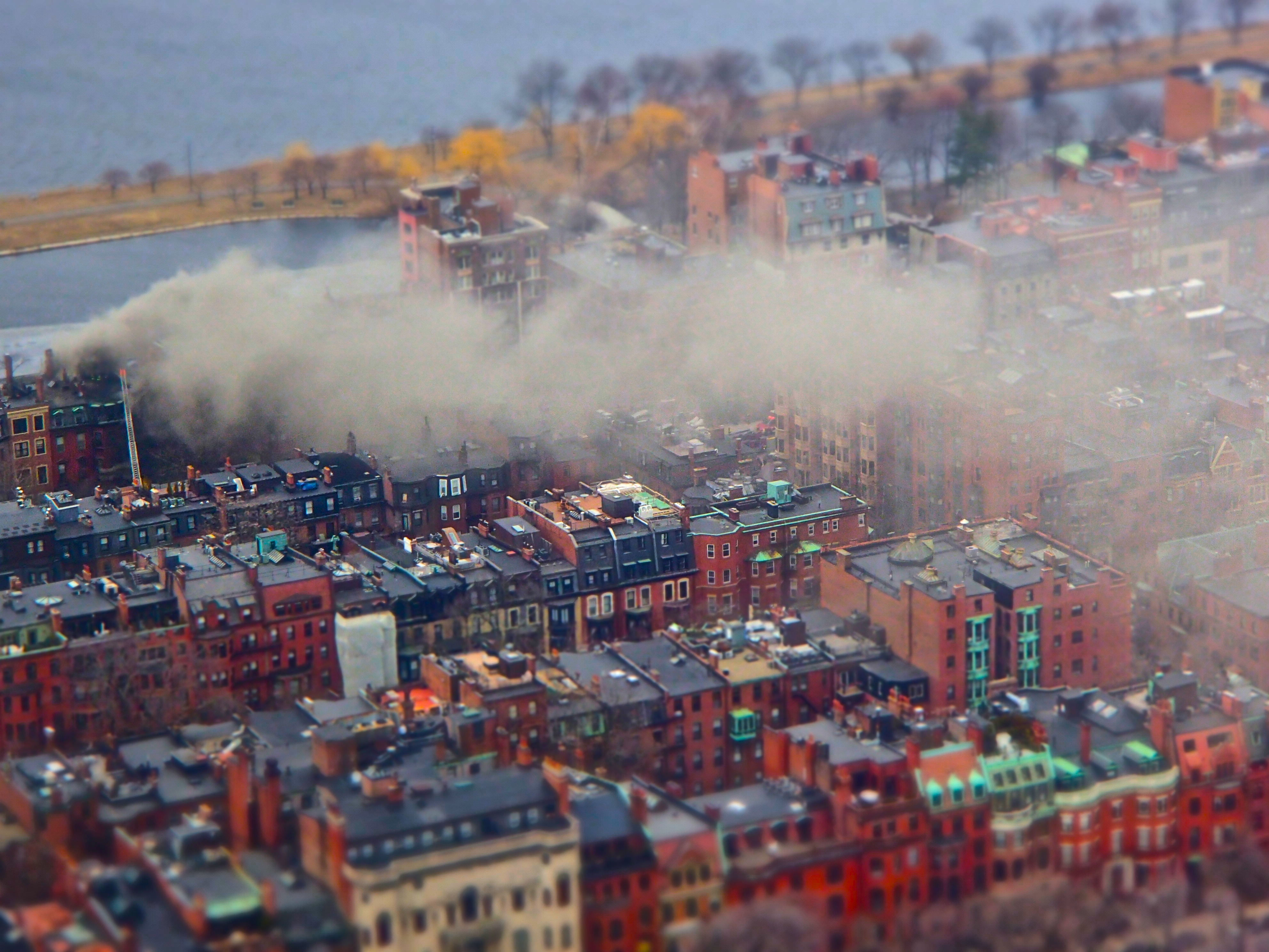 Today I had the fortune/misfortune of being at the top of the Prudential Center at about 3pm, when I spotted an enormous plume of smoke coming up from a building towards the Charles River.