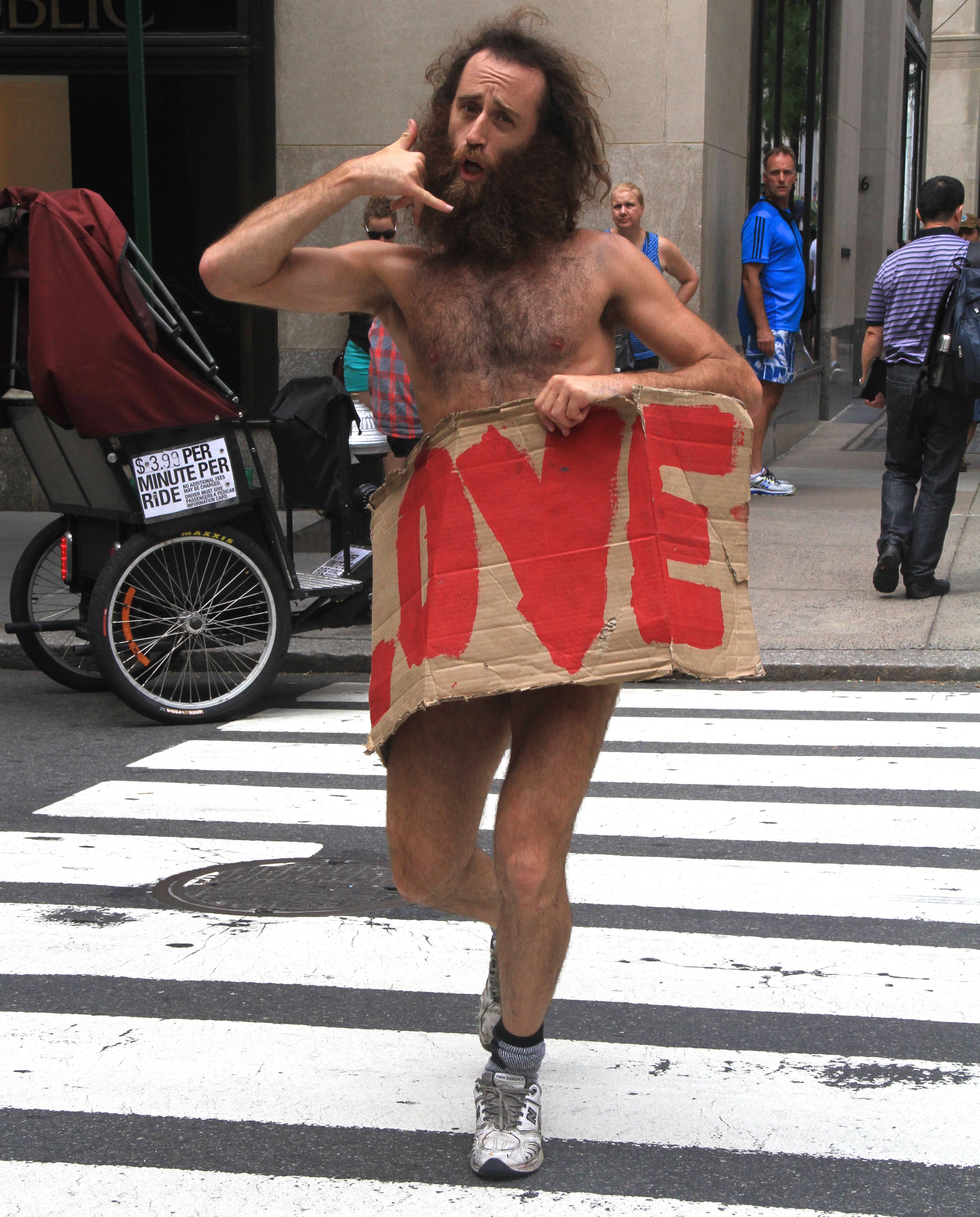 In a summer in the city, typical New York moment, the gentleman, who was not actually naked, saw me taking his photo when he was wearing his cardboard sign and signaled for me to call him. I have to say, it was a tempting offer. He’s just my type. Check him out: