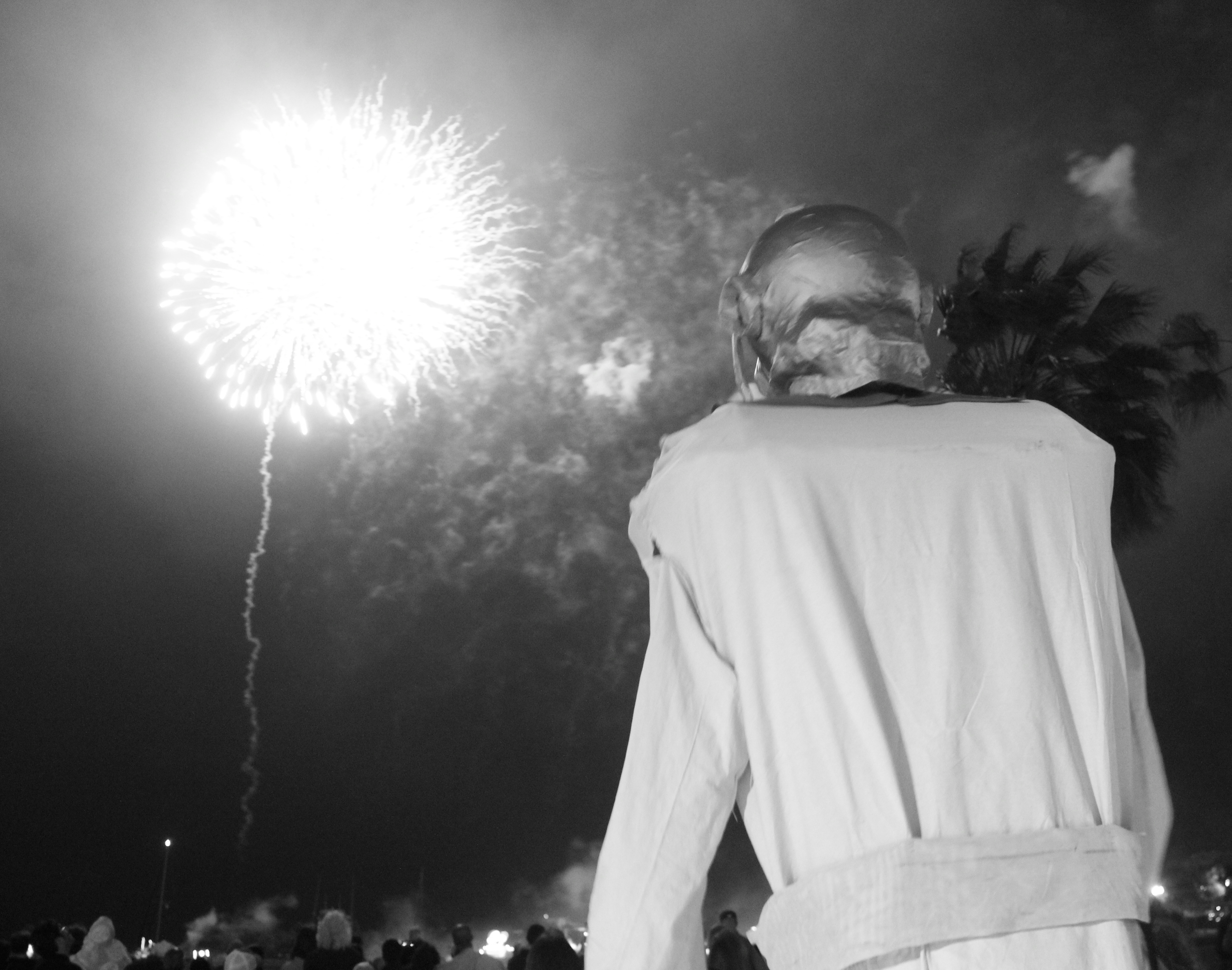 saint peterburg man in diver’s outfit watching fireworks black white