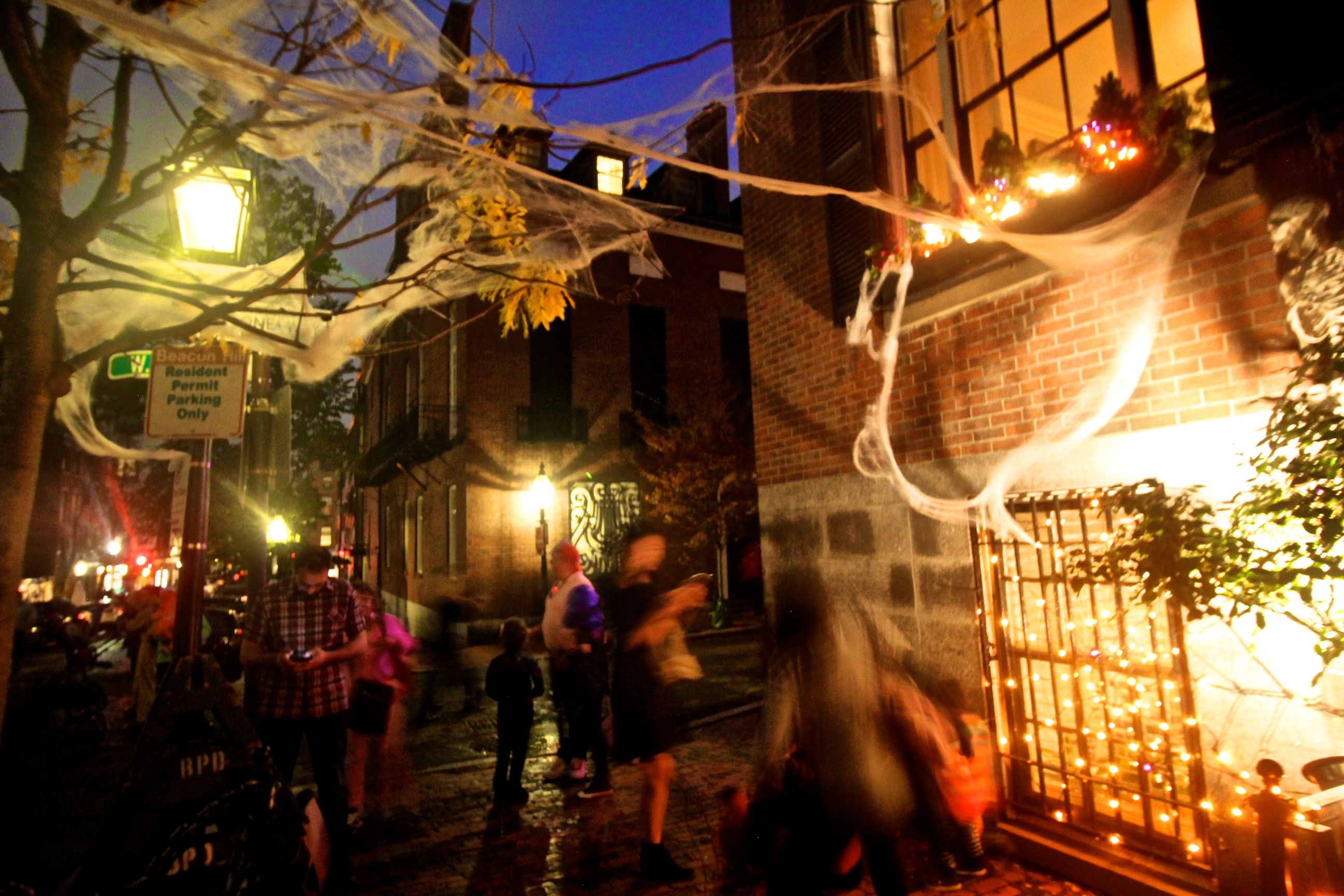 boston beacon hill halloween celebration 2019 spider web light people