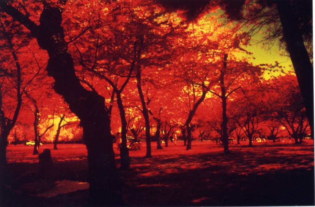 I had a distinct plan with the color infrared film, when I got my hands on it. I used to go to a place on Capitol Hill called Asman Photo, where I would get prints made and pick the brains of the people over there. I told someone over there that I was planning to shoot with color infrared film. My idea was to shoot the Washington cherry blossoms with the color infrared film. They gave me the best advice on how to shoot it properly. I had shot the cherry blossoms a year or two earlier, producing a set of pictures that my chief photography critic, my dad, termed “boring.” ”If we always told you you were good at photography, then you never would have gotten good at it,” direct quote from my dad. Love you, mean it!!!! I mean he was right. LOL.
