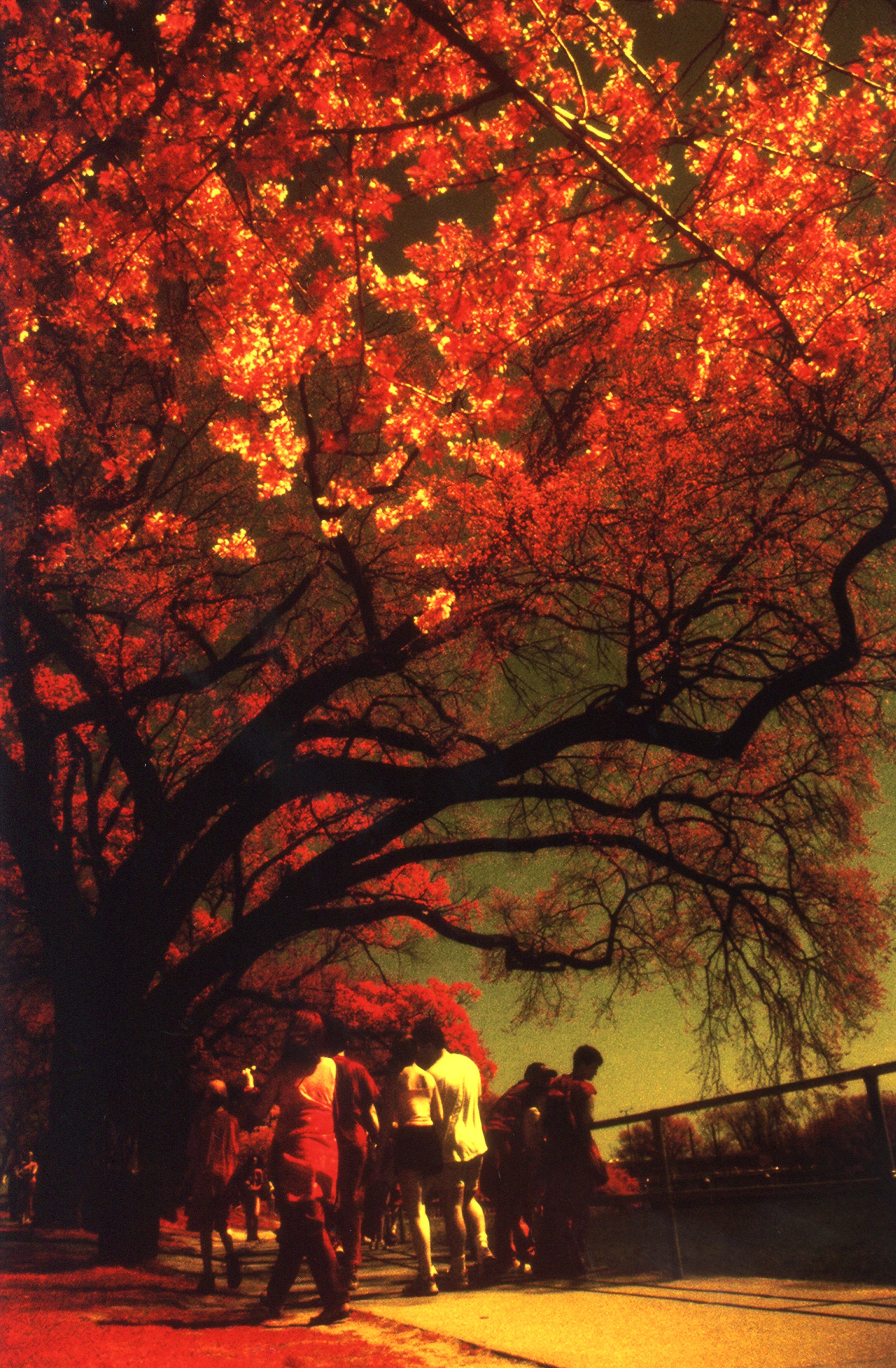 That project with cherry blossoms stuck in my head, sitting on that hand me down couch in the apartment in the background in that Polaroid. I actually had to wait until April, when they bloomed and a hot day to shoot the film. Now shooting color infrared was no joke. Only a Canon AE-1 could shoot it because even by then cameras had sensors in them that would just kill the film. It had to be loaded in the dark and removed in the dark. You need a red filter on the camera and your own light meter. But I wanted to do this, so off I went.