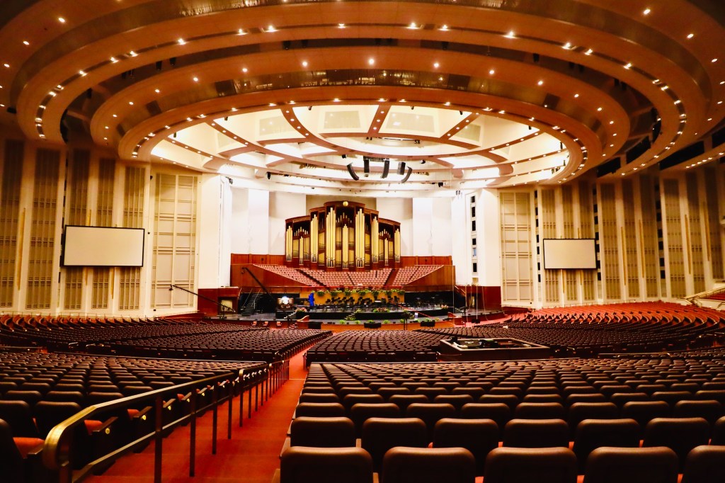 Walking in, you see large portraits of the leaders of the church. A man named Russell Nelson is the president of the The Church of Jesus Christ of Latter-day Saints. I want to call everyone in the church as correctly as I can. The next thing I saw was a huge church assembly hall that I later found out seats 2,000. There was some beautiful music playing there when I walked in. I had intended to walk in, take a rest and then take an elevator up to the roof deck, enjoy the roof deck and keep walking. Well, God or the temple had other plans.