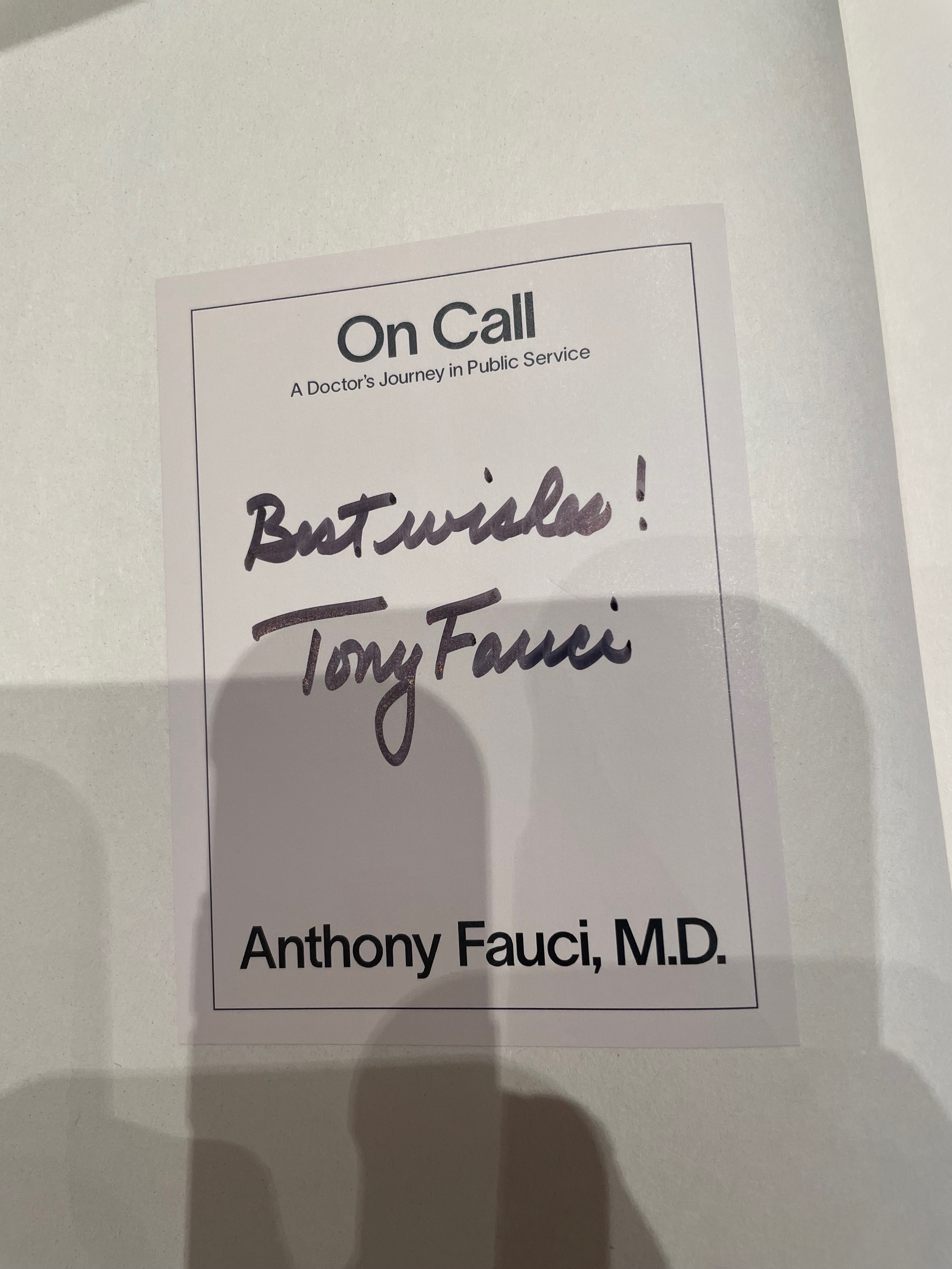 Here are some less than quality photos I snapped of Dr Fauci that night, including the book they gave us with his signature in it:
