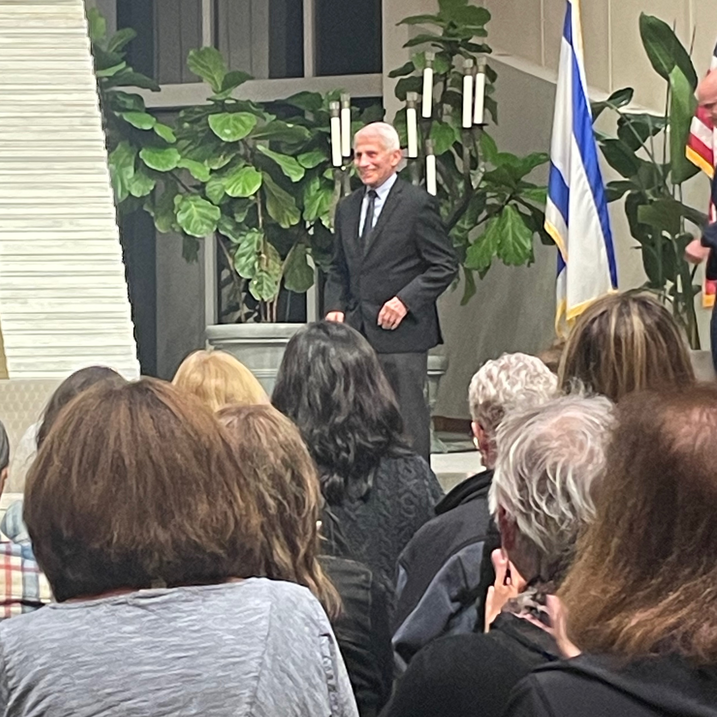 Fauci spoke at a synagogue near where I live.  Now the man has to travel with a rather menacing security detail.  When I bought the tickets, I got a list of things I was NOT allowed to bring to the event, that included drones and anything that could be used as a missile.  Where I was going to put that in my saffiano leather Dooney and Bourke hobo bag is anyone’s guess.  Needless to say, I was not bringing any of my myriad of cameras, a fact that pained me.  Pics or it didn’t happen, right?